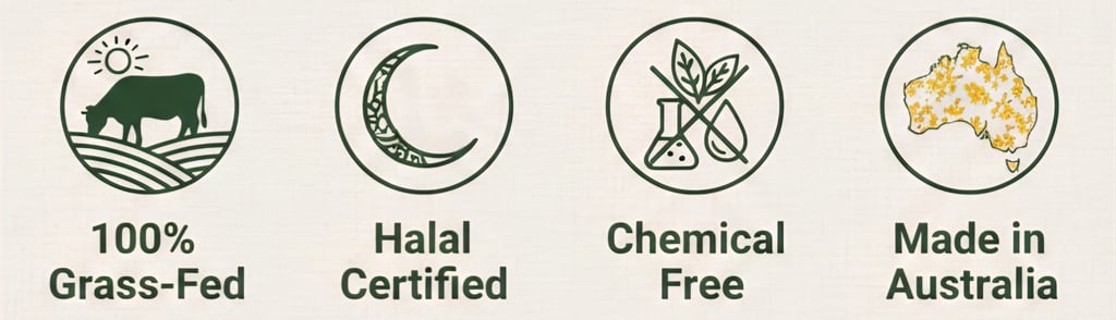 At Oz Tallow Skincare, we believe in returning to the essentials: pure, clean, and honest skincare, created with integrity. That’s why our formulations are 100% water-free, allowing every ingredient to work at its highest potency—without dilution, fillers, or preservatives. Our products are made with 100% tallow from grass-fed, halal-certified cows, carefully selected to nourish skin as nature intended.
